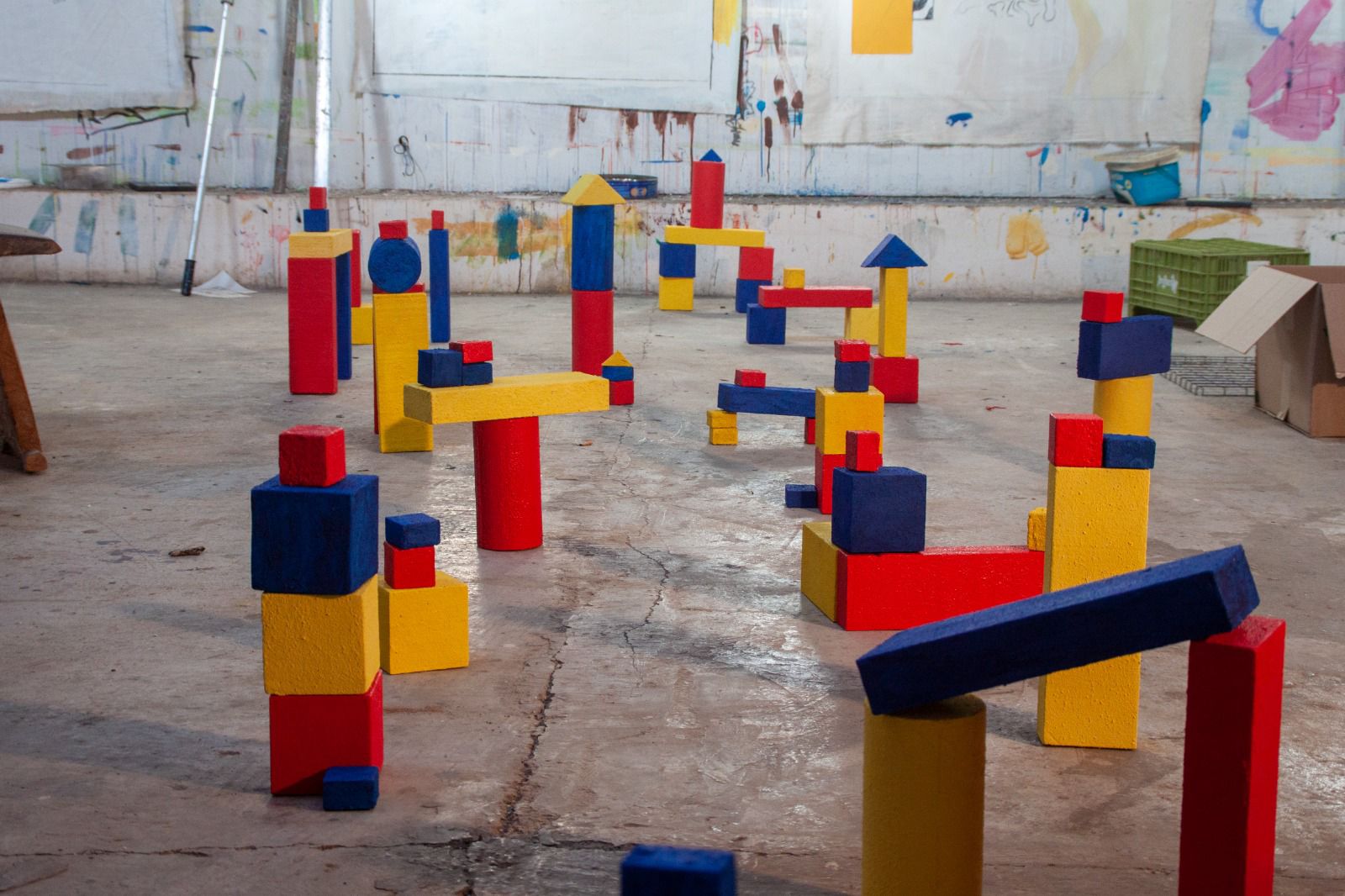 Sapere construeix la proposta a través de peces de fusta de colors, aquelles amb les quals de petits construíem ciutats i cases d’infants. Aquestes peces, fetes amb porexpan recobertes amb una capa d’arena de marès i pintades a mà son l’element central de l’obra. Aquest material, diu Sapere, li resulta molt útil i pràctic perquè no pesa i això fa que siguin bones de transportar i també que li puguis donar totes les formes que vulguis. Així mateix, el material permet ser pintat amb facilitat.