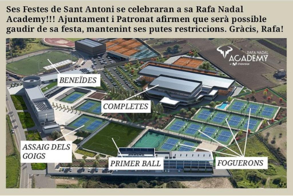 Els nostres amics col·laboradors del Comtugueda, a banda del col·lage que ens fan arribar cada mes, també estan molt actius a les xarxes socials. Aquesta mateixa setmana feien una publicació amb l’ocurrència i l’oportunitat que els caracteritzen. Després de la suspensió arran de la Covid-19, sembla que Patronat i Ajuntament haurien trobat la solució perquè la festa més estimadas de la gent manacorina pugui celebrar-se finalment. Rafel Nadal sembla que hauria cedit la seva acadèmia, de forma global, perquè a cada lloc hi pogués tenir cabuda un dels actes de la festa. A la pista coberta, per descomptat, les Completes!