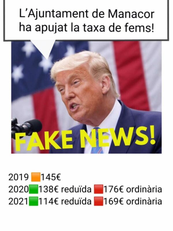 Es veu que el delegat de Medi Ambient no va de verbes, i que segons quins coverbos de l’oposició no li acaben de caure bé. En una explicació molt gràfica a les xarxes, Llodrà aclaria que la tarifa ordinària de residus és de 169 euros el 2021 i de 176 el 2020, mentre que la reduïda és de 114 el 2021 i era de 138 el 2020. La imatge que il·lustra el post de Llodrà ho diu tot. Deu voler comparar Donald Trump amb qualcú?