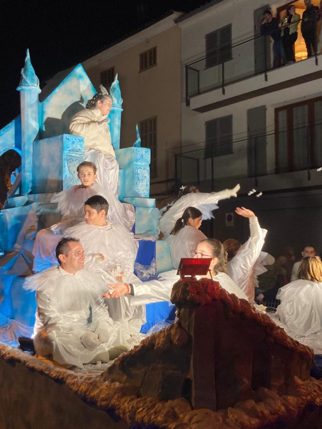 A partir d’aquí la fantasia s’intercalà amb les carrosses d’uns reis més reials i més reals que cap altre dia de l’any. La llum i l’esplendor de les carrosses carregades d’or, encens i mirra, contrastava amb la fosca tancada del vespre primerenc d’hivern. Els regals ja devien ser a moltes de cases, perquè els Reis, per poder atendre tothom, han d’avançar feina. Frozen corresponia a la temperatura gèlida del vespre, escalfada per la lluentor il·lusionada dels ulls dels infants.