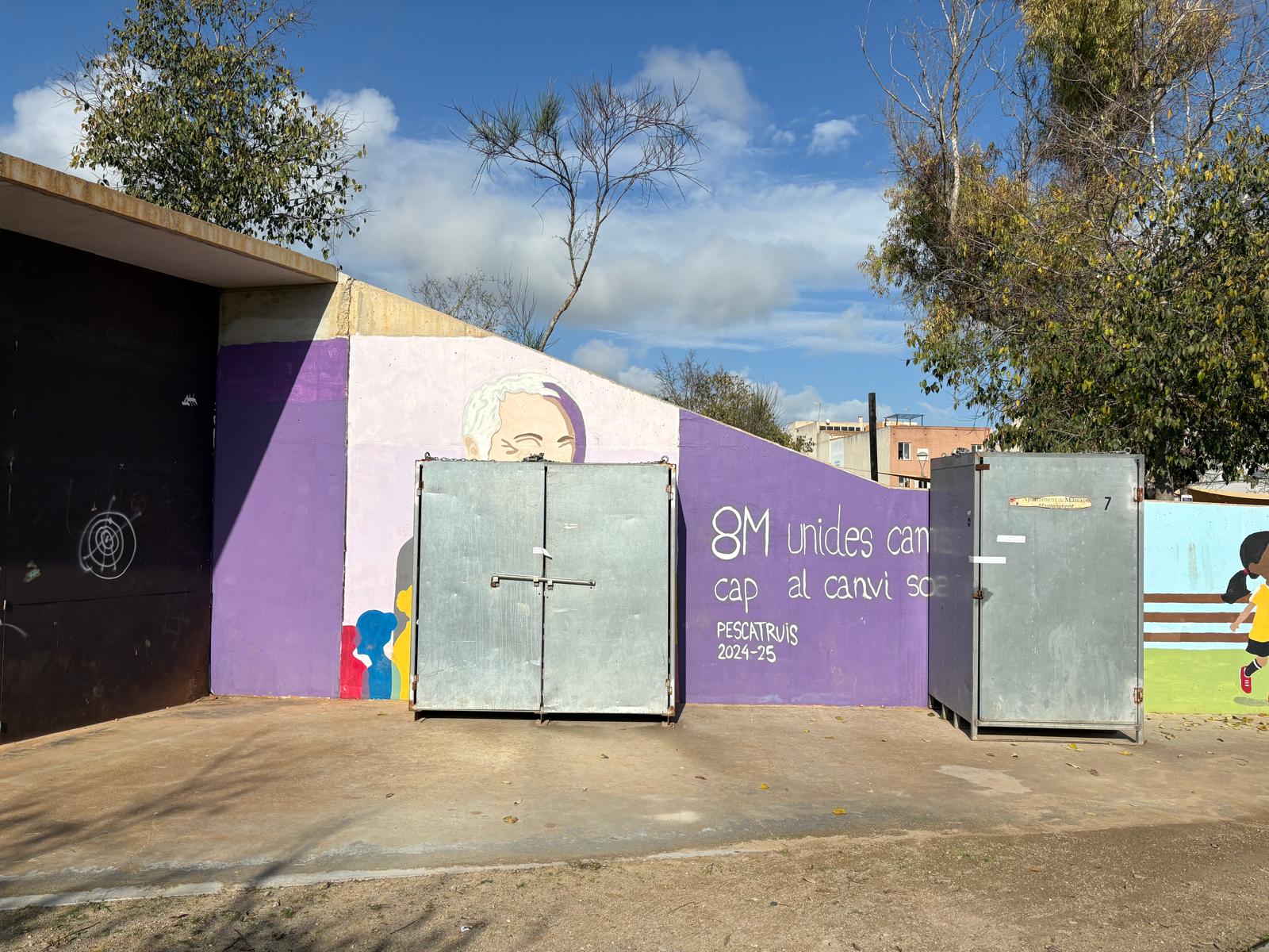 És això que els anglosaxons titllarien de win-win i nosaltres de jugada mestra. D’una banda, el mural no es veu i així no molesta a la vista dels masclistes que perpetren les pintades. El fet que estigui tapat per aquests grans calaixos, però, també suposa que, si en qualsevol cas, se sentissin temptats d’accedir a fer qualque pintada intolerant, tampoc podrien fer-ho!