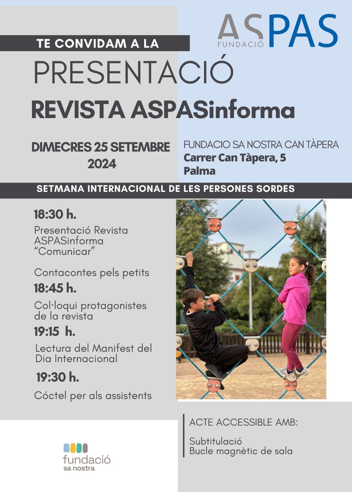 La Setmana Internacional de les Persones Sordes se celebra cada any, la darrera setmana de setembre i inclou els dies dedicats al Llenguatge de Signes i el Dia Internacional de les Persones Sordes, que és dia 25. Coincidint amb aquesta data, de fet, l’entitat celebra avui a partir de les 18.30 h a la seva seu de Palma un esdeveniment que comptarà amb la lectura del manifest del dia internacional, contacontes per als petits i la presentació de la revista ASPASinforma. ASPAS (Fundació de Pares de persones amb discapacitat auditiva) és una entitat sense afany de lucre que ofereix atenció integral a les persones amb discapacitat auditiva i a les seves famílies, amb l’objectiu d’aconseguir la seva plena inclusió social. Parlam amb Carme Zoilo, responsable i logopeda d’Aspas Manacor.
