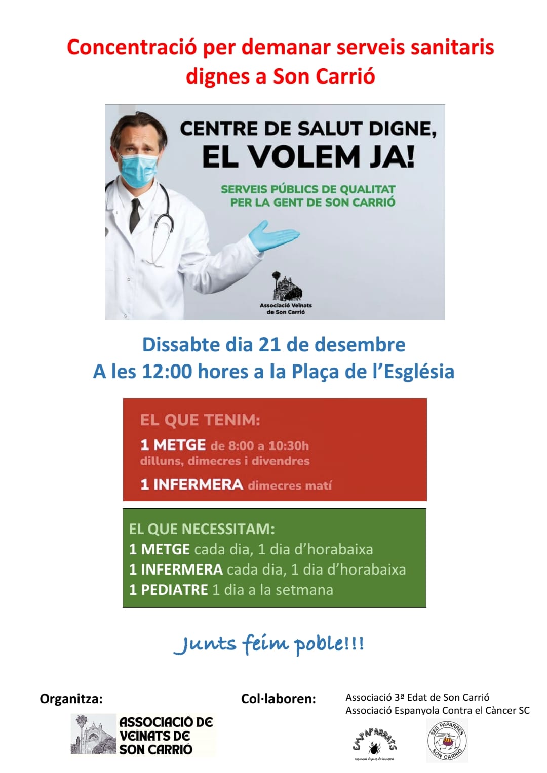 L’Associació de Veïnats de Son Carrió en col·laboració amb l’Associació 3a edat i l’Associació Espanyola Contra el Càncer de la localitat han convocat per aquest dissabte una concentració per reclamar una serveis sanitaris dignes.