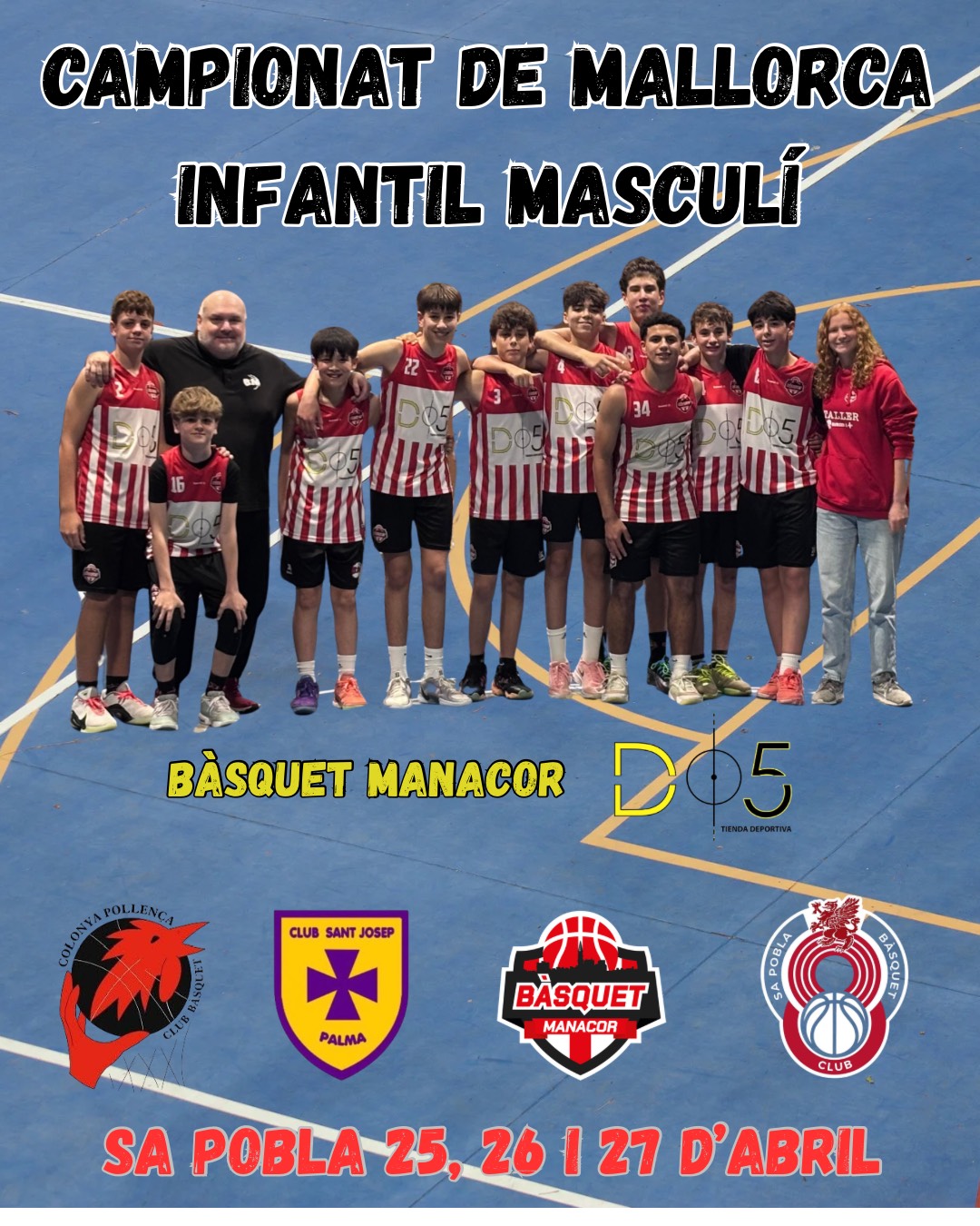 Per la seva banda, l’infantil D5 Sport Shop disputarà el campionat a Sa Pobla. El primer dia s’enfrontaran al Pollença a les 18.30 h; dissabte jugaran contra el Sant Josep a les 17 h i diumenge jugaran contra el Sa Pobla a les 17 h.