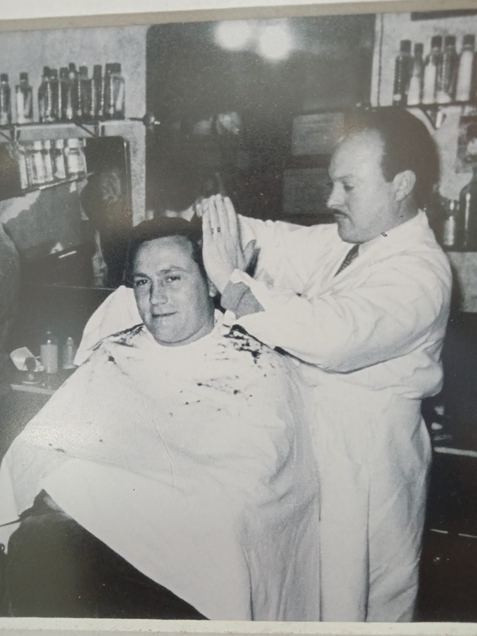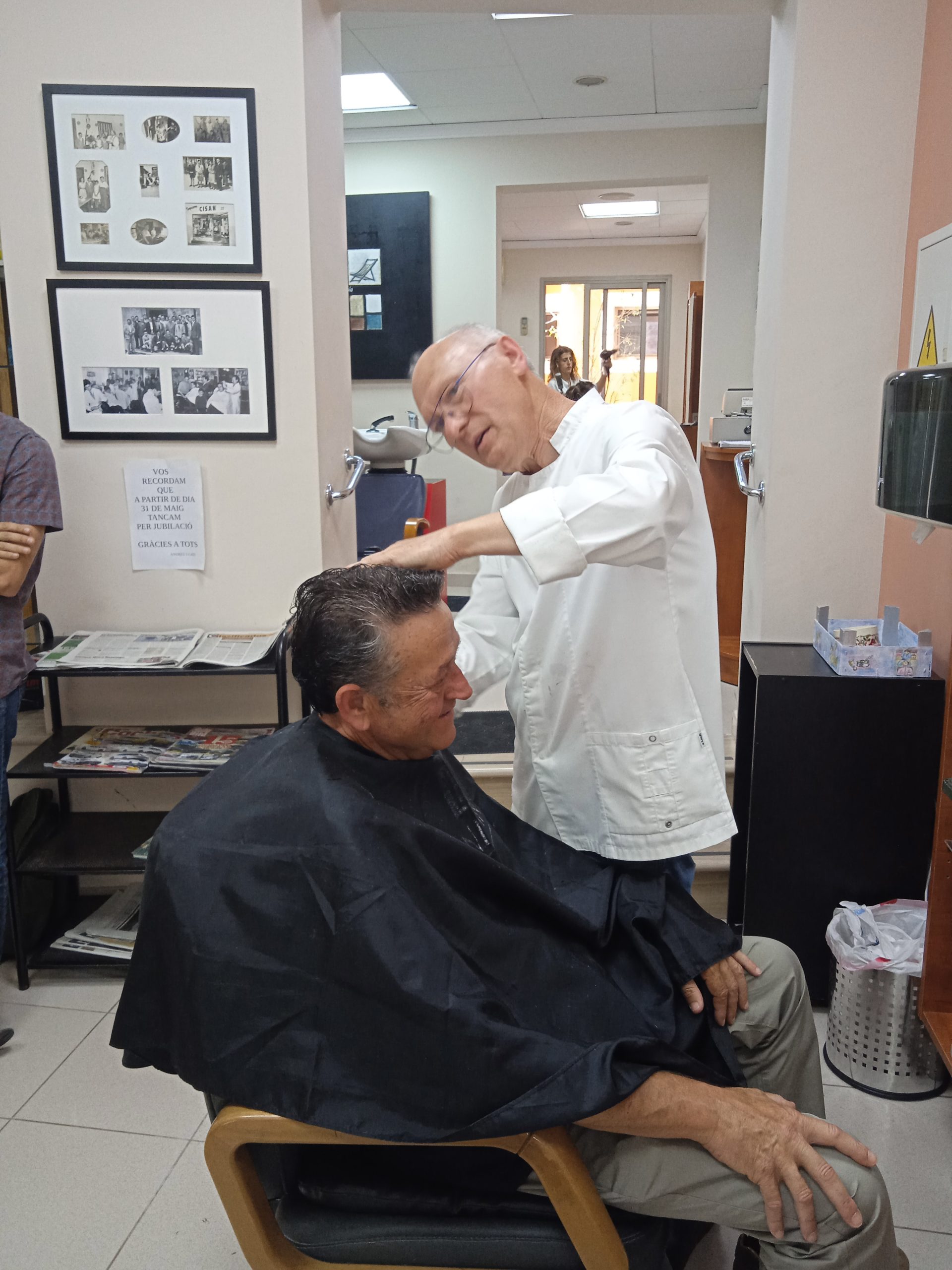 N’Andreu Gomila d’ençà que va néixer és client de n’Andreu Curt. Això és, sens dubte, un acte de fidelitat i de confiança. En aquesta ocasió li arregla la barba amb la màquina i li rasura la part del coll allà on aquesta s’ha allargat en excés.