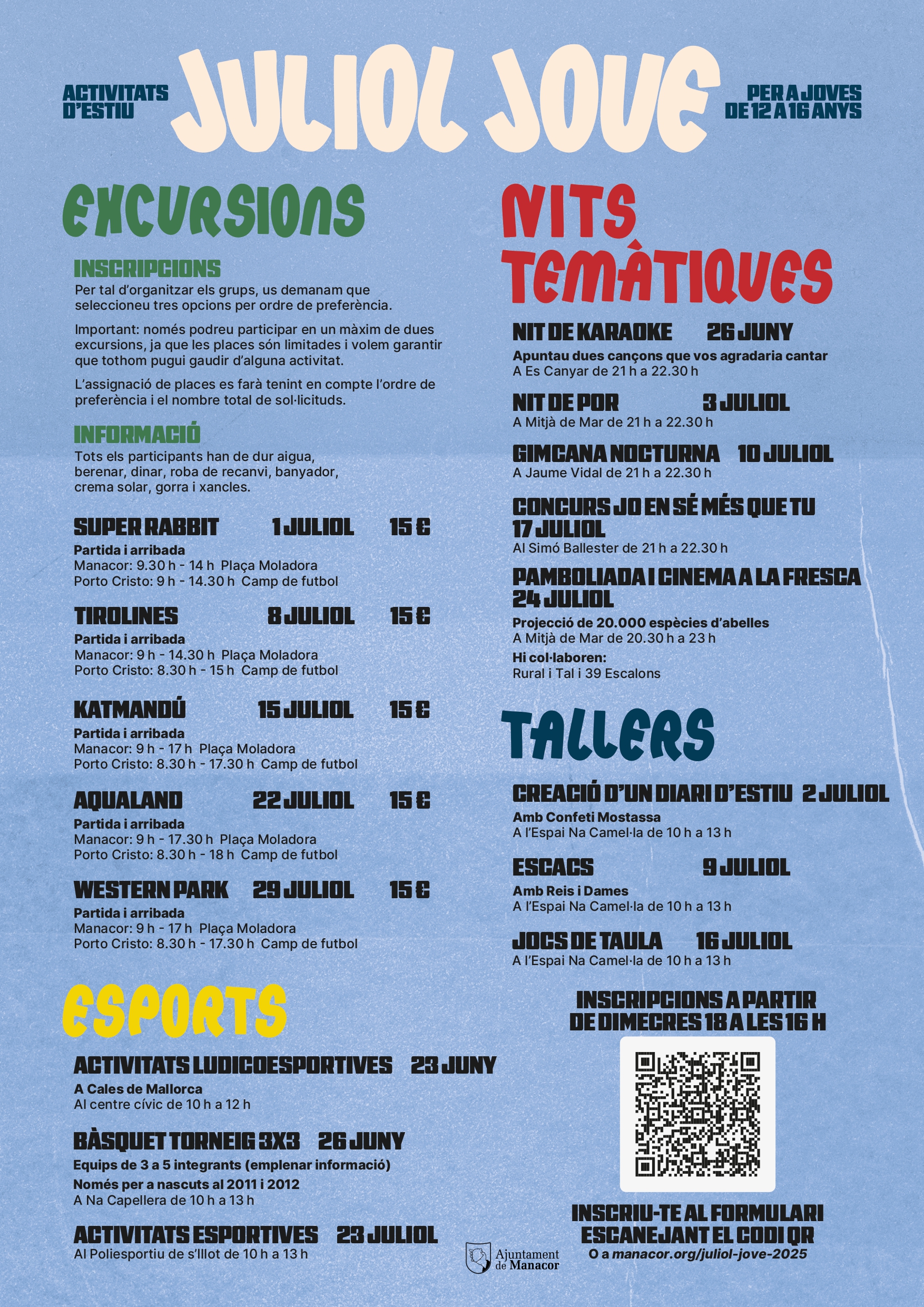 Les activitats tendran lloc dimarts, dimecres i dijous de cada setmana durant el mes de juliol. L’Ajuntament demana als joves que hi vulguin participar que emplenin el formulari en línia que es posarà actiu demà dimecres a partir de les 16h. L’organització, per assegurar que tot es du a terme de la forma més correcta demana que siguin els tutors legals dels joves els qui emplenin les inscripcions. En segons quins tallers, les places són limitades, i en d’altres, també anirà bé tenir coneixement de les persones que hi hagi inscrites, per determinar quins recursos seran necessaris.