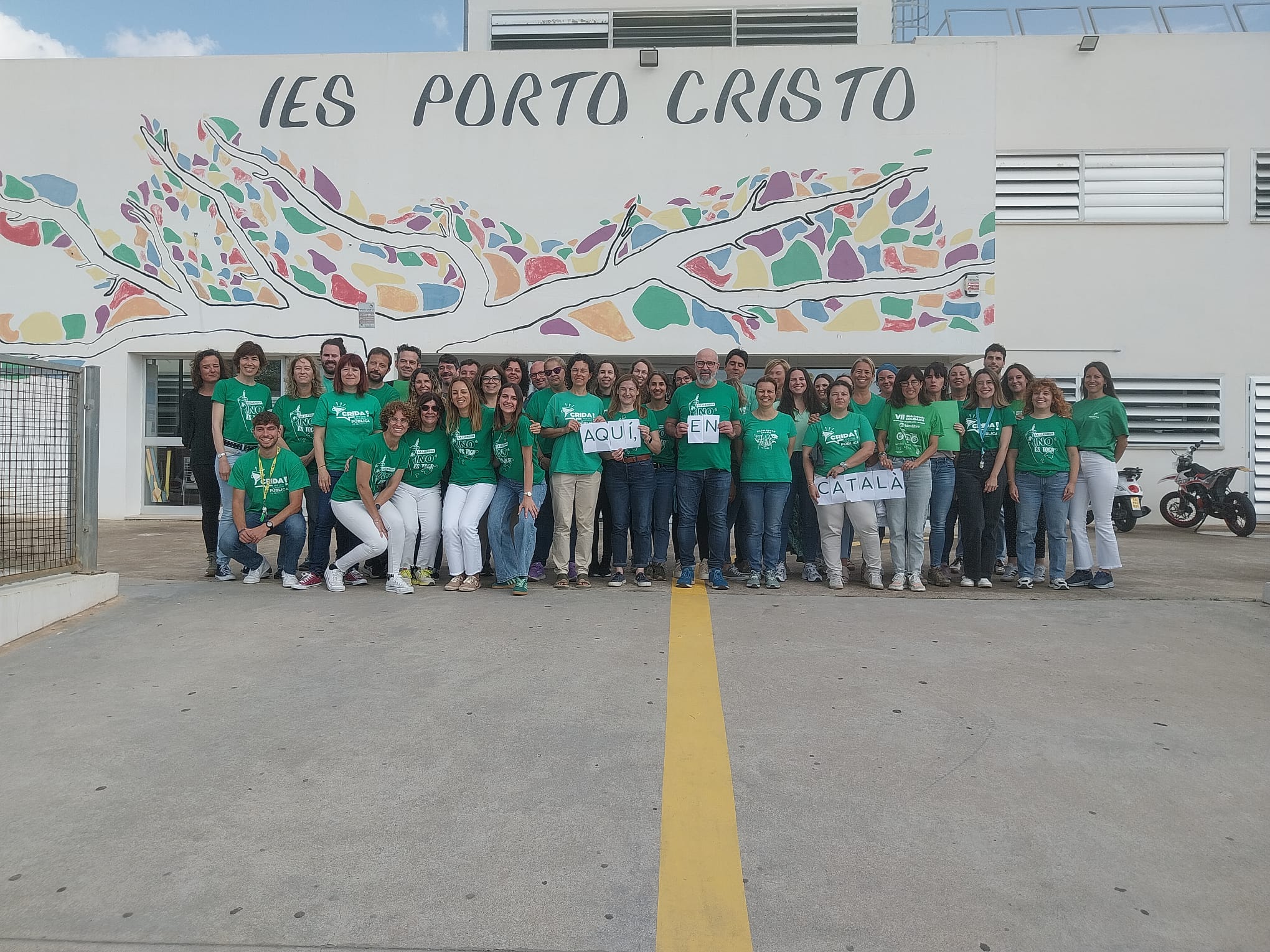 Aquesta setmana passada el conseller d’Educació Antoni Vera ha visitat diferents centres educatius del terme municipal. Com ja és habitual en aquesta tournee del conseller Vera, les camisetes verdes hi són una decoració habitual. Així el reberen, per exemple, a l’IES Porto Cristo, recordant davant les seves pretensions que “aquí, en català”.