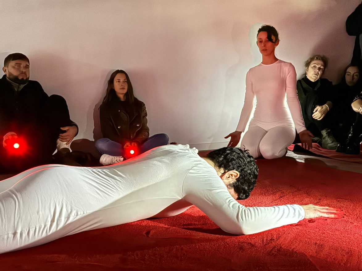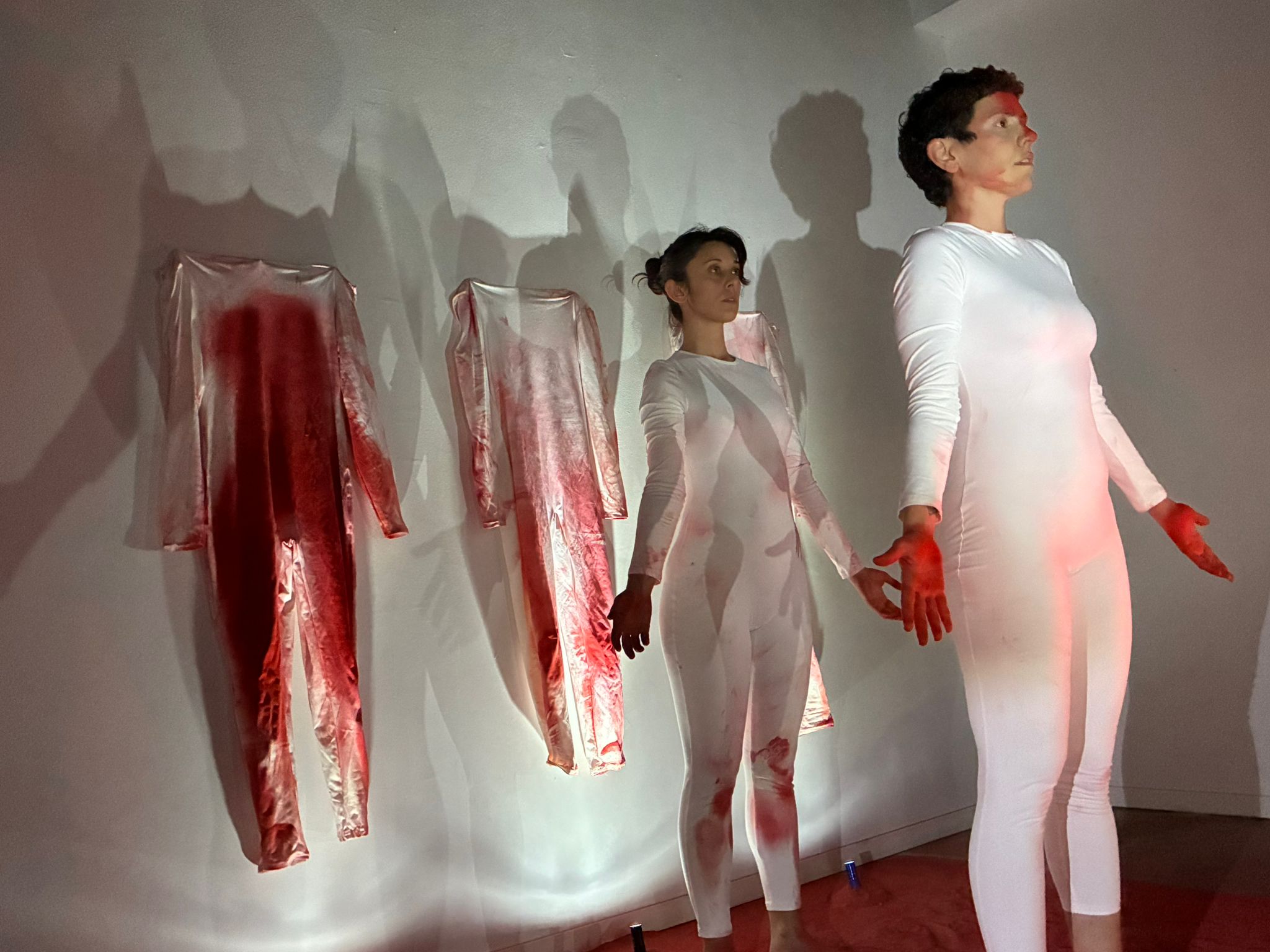 Finalment, una arena feta del color de la sang, un rectangle perfecte, uns límits moilt marcats, una llum tímida. Surten dues dones com si fossin una de sola. Com si es miràs a si mateixa, s’observa dins l’altra. Blanquíssimes, pures, com si no haguessin viscut, com si estigués a punt de començar qualque cosa molt gran. Atònites i tendres, les mirades. Com deu ser, atònita, i tendra, la mirada de qui acaba de néixer. I després viure: la dona com una serp batallant amb la vida i amb la sang, amb el cos i amb la terra, dins un espai sonor que embolcalla, que agombola i que inquieta alhora. La primera pell, la primera vivència, la primera sang, el primer dolor penjat a la paret. I com si aprenguéssim a viure, o com si tot fos més prudent, o més assumible, la segona pell… menys vermella, però igualment viscuda. I la tercera, on la vermellor de l’arena i de la vida, la sang viscuda, és més fruit de l’autoconeixement i la introspecció. Els cossos, il·luminats per les llanternes, ens miren.