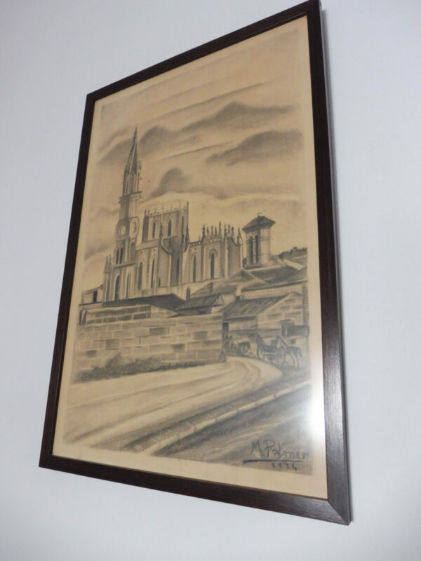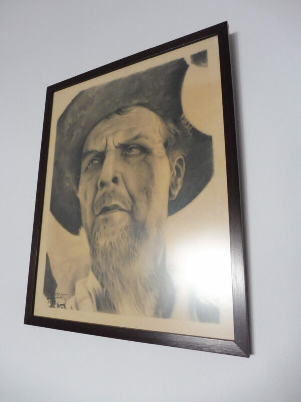 Entre els pocs records materials que conserva la família de Miquel Palmer Duran hi ha diversos dibuixos fets amb gran traça. Grans quadres preciosos, retrats, paisatges locals en carbonet. A jo, però, m’ha cridat l’atenció aquest. Signat discretament a la part inferior dreta per l’autor, s’hi pot veure una cara masculina, probablement la d’un frare o un filòsof de l’Antiga Grècia. O per ventura és algun personatge d’un d’aquells pasquins de pel·lícules que li agradava estotjar per després poder-los reproduir sobre tela. Qui era aquest personatge que un dia en Miquel va decidir dibuixar? Segurament no ho sabrem mai.