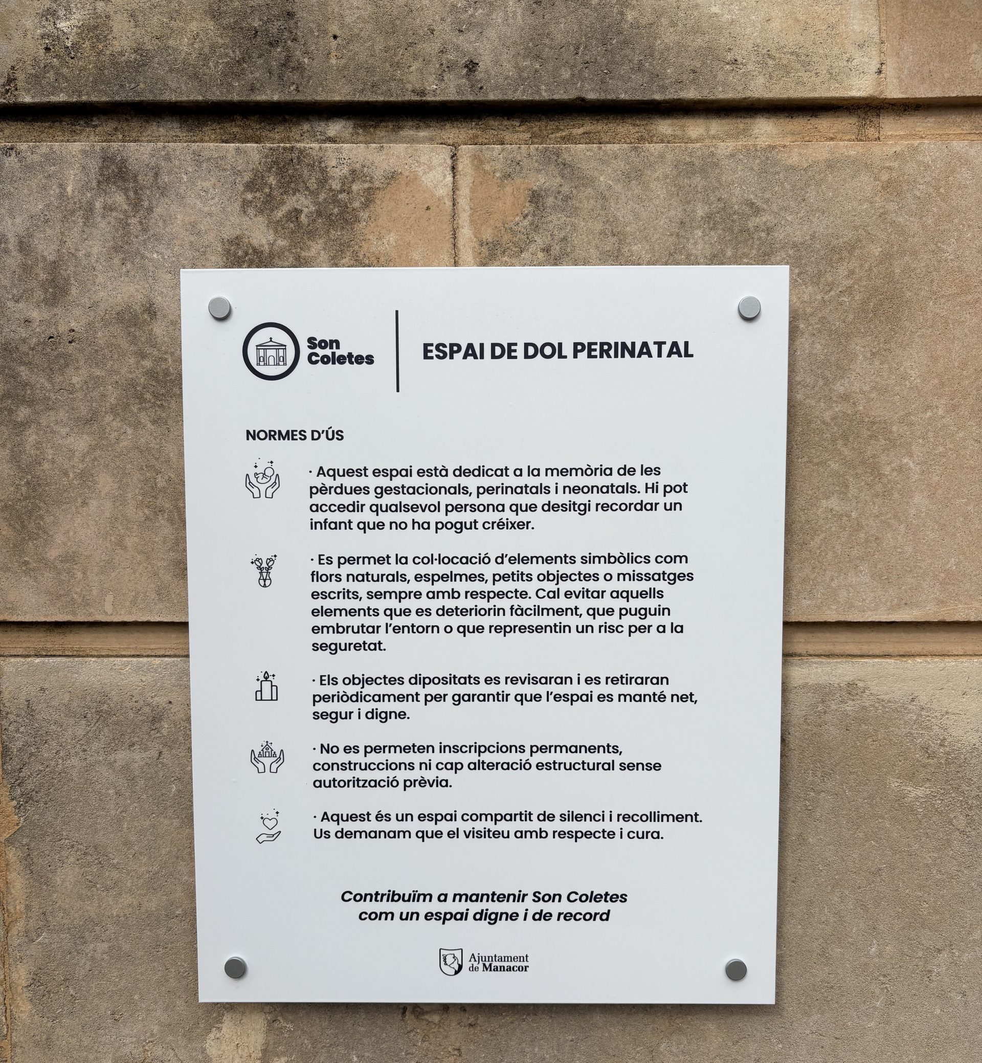 Una de cada quatre dones hi passarà. Algunes d’elles, més d’una vegada. La pèrdua d’un infant durant l’embaràs, durant el part o poc temps després de néixer suposa un gran xoc emocional per a les mares i els pares, i també per a l’entorn familiar proper. Per donar suport a aquestes situacions comunes, però que encara són un tabú, l’Ajuntament de Manacor ha presentat aquest matí l’espai de dol perinatal, coincidint amb la commemoració del Dia del Dol Perinatal, que se celebra cada 15 d’octubre.