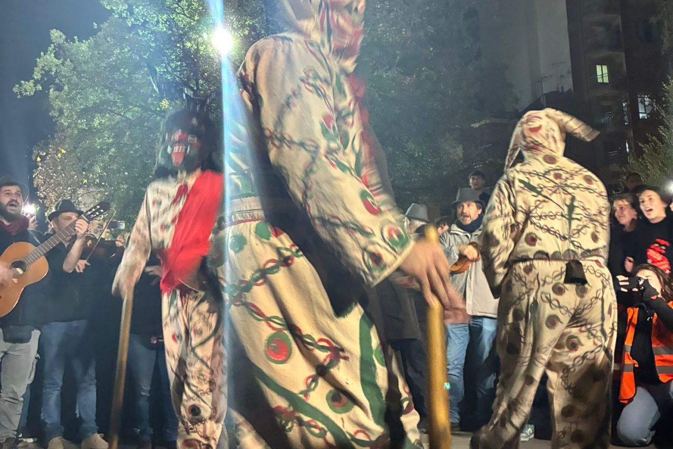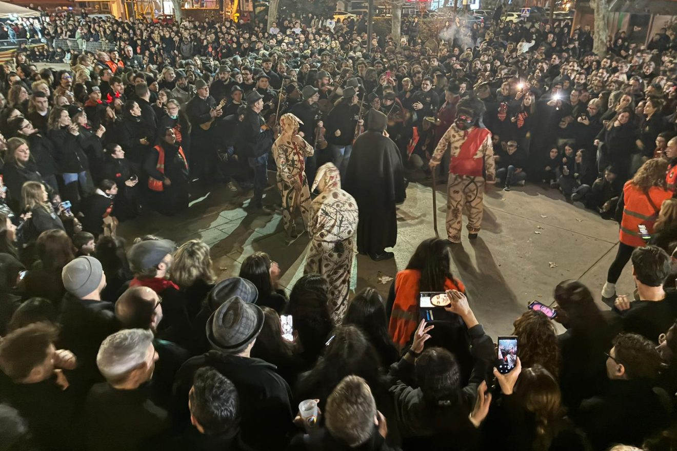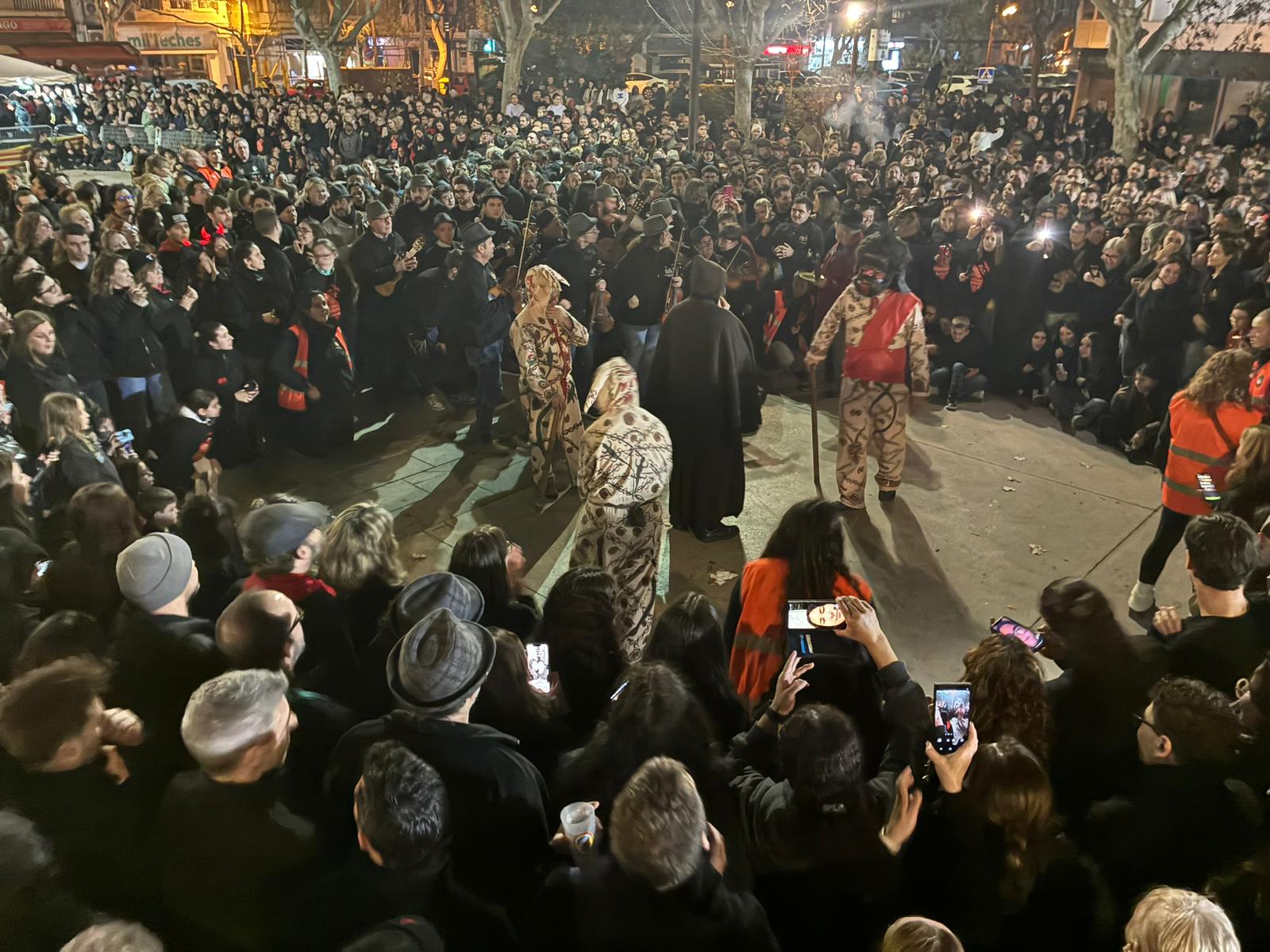“Ca! I hi ha més policies que dimonis”, deia un santantonier granat a les portes de l’Escola de Música. Una vegada més, la festa es presentava custodiada per l’autoritat policíaca., que havia disposat, a més, un passadís amb tanques metàl·liques que permetés transitar els dimonis i els sonadors peu pla i ben amples des del Conservatori fins a la part de baix de la plaça de Ramon Llull on ja hi havia configurat, d’una bona estona abans el primer rotlo de ball.