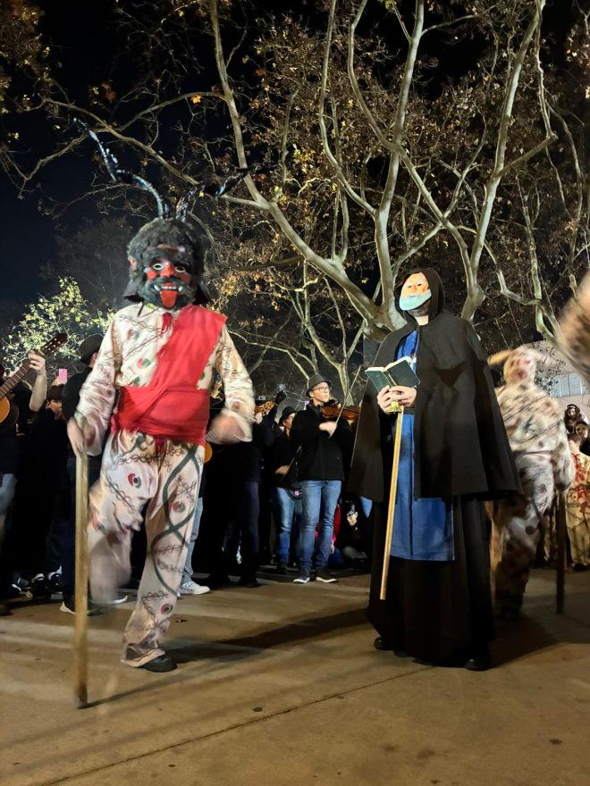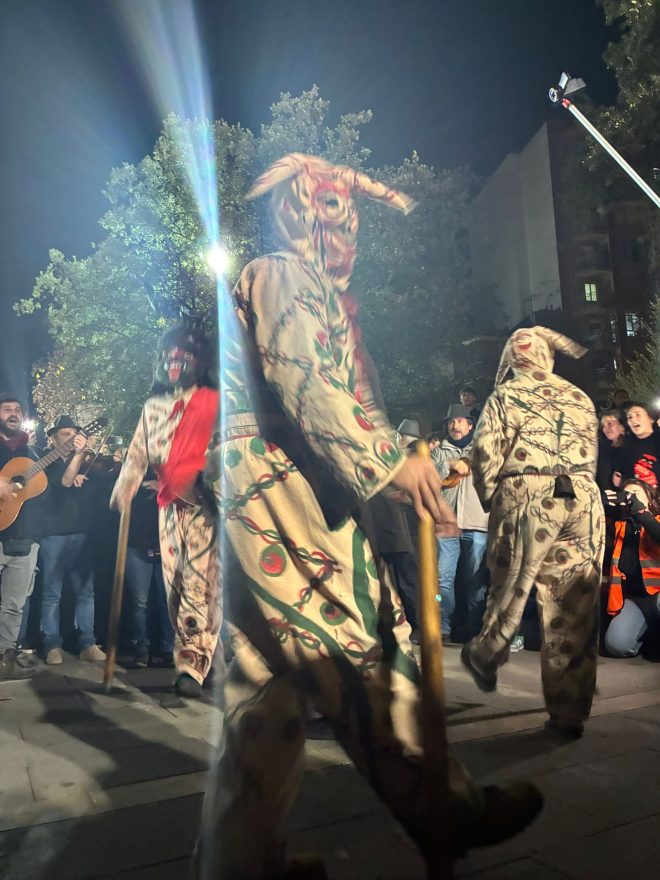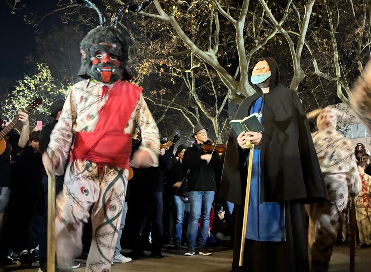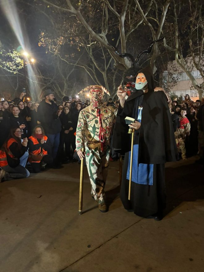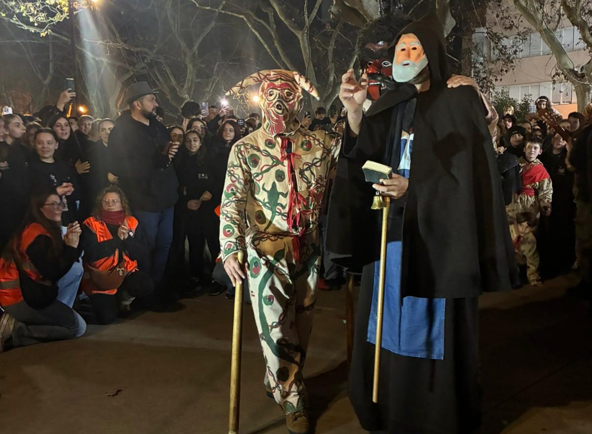 “Ca! I hi ha més policies que dimonis”, deia un santantonier granat a les portes de l’Escola de Música. Una vegada més, la festa es presentava custodiada per l’autoritat policíaca., que havia disposat, a més, un passadís amb tanques metàl·liques que permetés transitar els dimonis i els sonadors peu pla i ben amples des del Conservatori fins a la part de baix de la plaça de Ramon Llull on ja hi havia configurat, d’una bona estona abans el primer rotlo de ball.