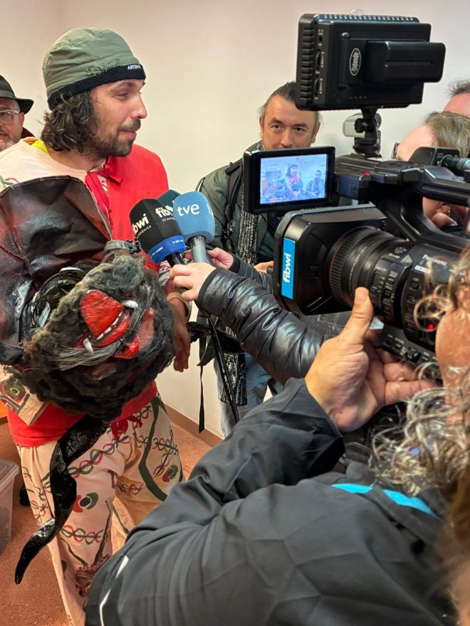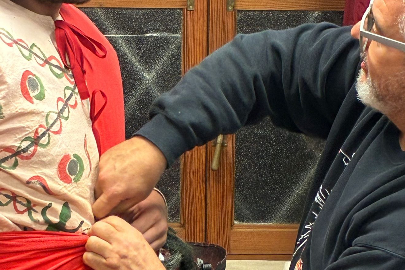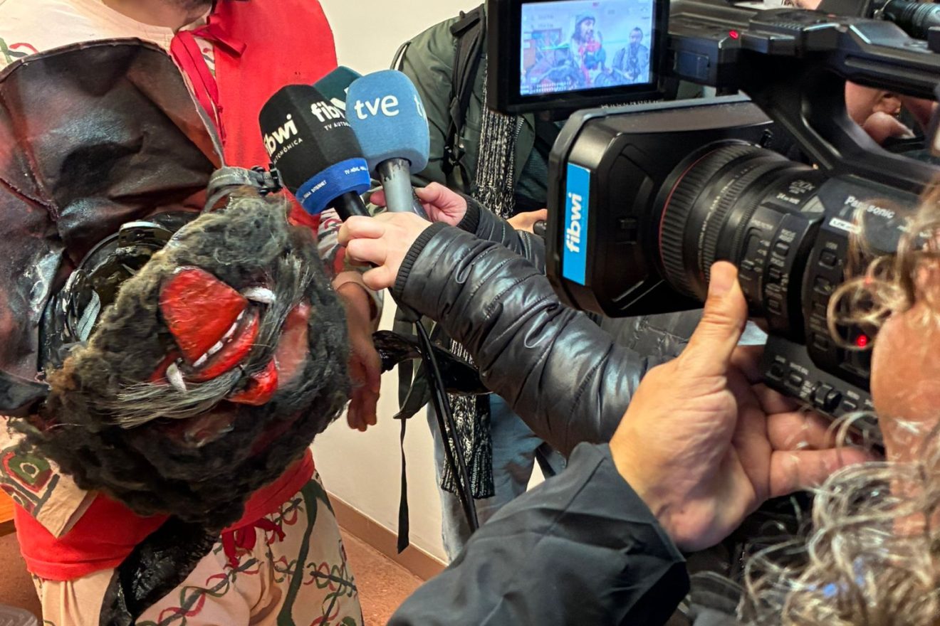 Toni Lluís Reyes, una vegada posada la gorra protectora mira d’enfundar-se la carota. Una vegada, dues, tres. Demana l’ajuda a Magdalena Pérez. I finalment, reïx en l’intent. Mentrestant, els sonadors no perden el temps, i sonen les cançons de sempre, una trentena d’amics, familiars i periodistes contemplen l’escena.