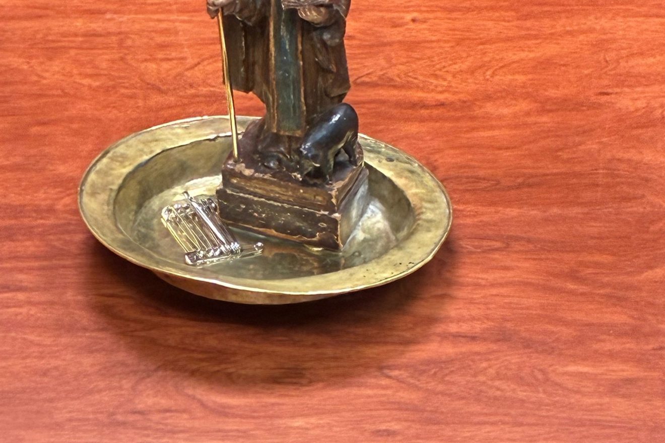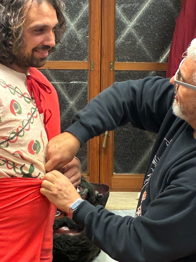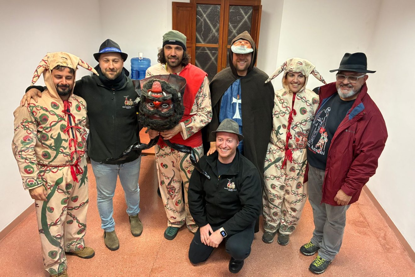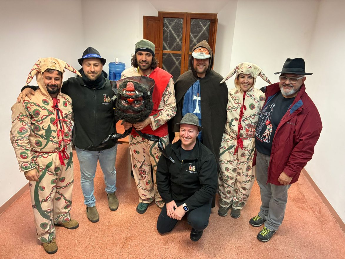 Toni Lluís Reyes, una vegada posada la gorra protectora mira d’enfundar-se la carota. Una vegada, dues, tres. Demana l’ajuda a Magdalena Pérez. I finalment, reïx en l’intent. Mentrestant, els sonadors no perden el temps, i sonen les cançons de sempre, una trentena d’amics, familiars i periodistes contemplen l’escena.