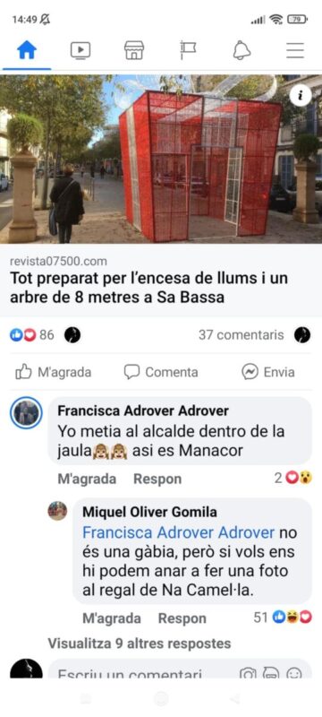Una gàbia per al batleA la pàgina de Facebook d’un conegut digital manacorí es feien ressò de l’encesa de llums de Nadal d’aquests pròxims dies, que il·lustraven amb una imatge de la capsa de regal il·luminada que presidirà el passeig de Na Camel·la. Una lectora entusiasta responia: “Jo hi ficaria el batle, dins aquesta gàbia. Així és Manacor…”. La cosa curiosa és que el comentari va tenir resposta de la primera vara manacorina. Miquel Oliver hi deia: “No és una gàbia, però si vols ens hi podem anar a fer una foto, al regal de Na Camel·la”.