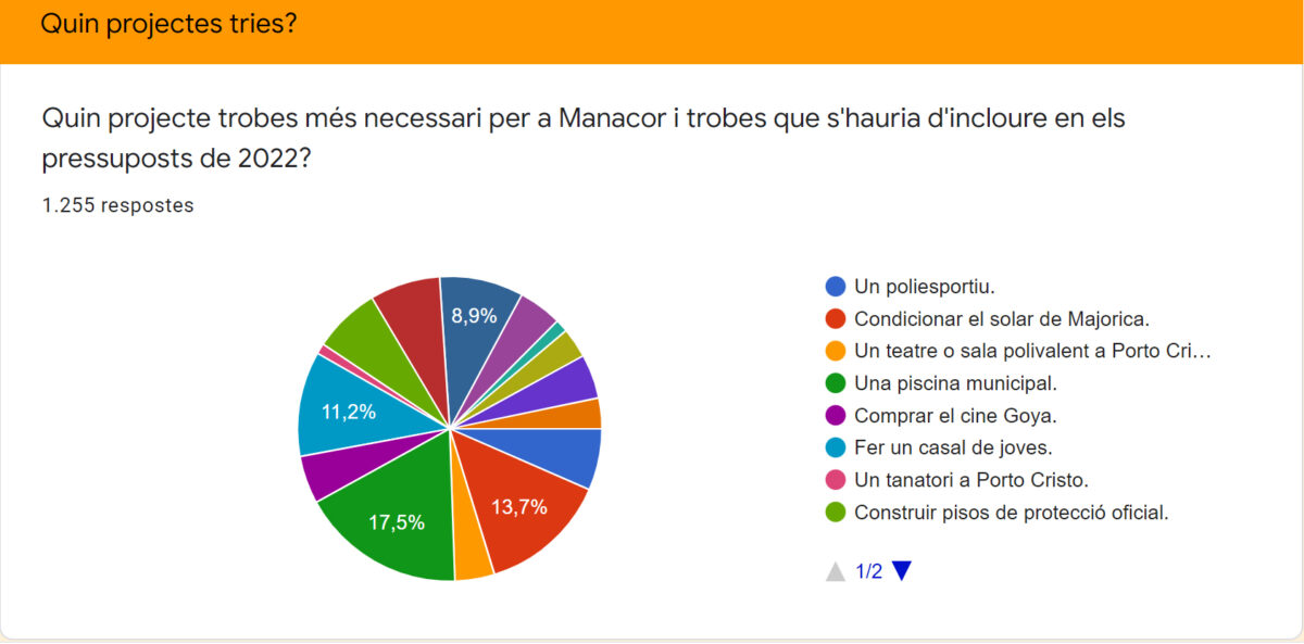 Un senzill formulari de Google difós a través de Whatsapp ha estat suficient per copsar quines són les necessitats dels ciutadans del municipi de Manacor segons ells mateixos. En poc més de 24 hores, Cent per Cent ha recollit gairebé 1.300 respostes a un formulari on es demanava als ciutadans de Manacor que triassin entre un total de 15 projectes a diferents nuclis del municipi.